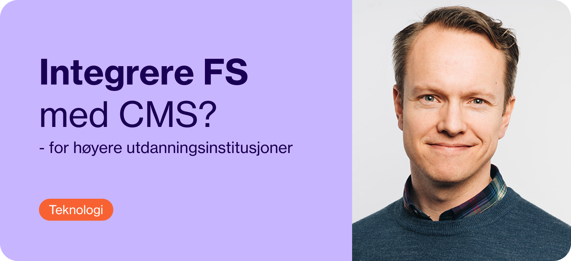Felles Studentsystem (FS) brukes av de fleste høyere utdanningsinstitusjoner i Norge i dag. Bli med på webinar og oppdag hvordan vår API-integrasjon mellom nettsiden og Felles Studentsystem (FS) kan effektivisere og forbedre formidlingen av studieinformasjon til studenter.